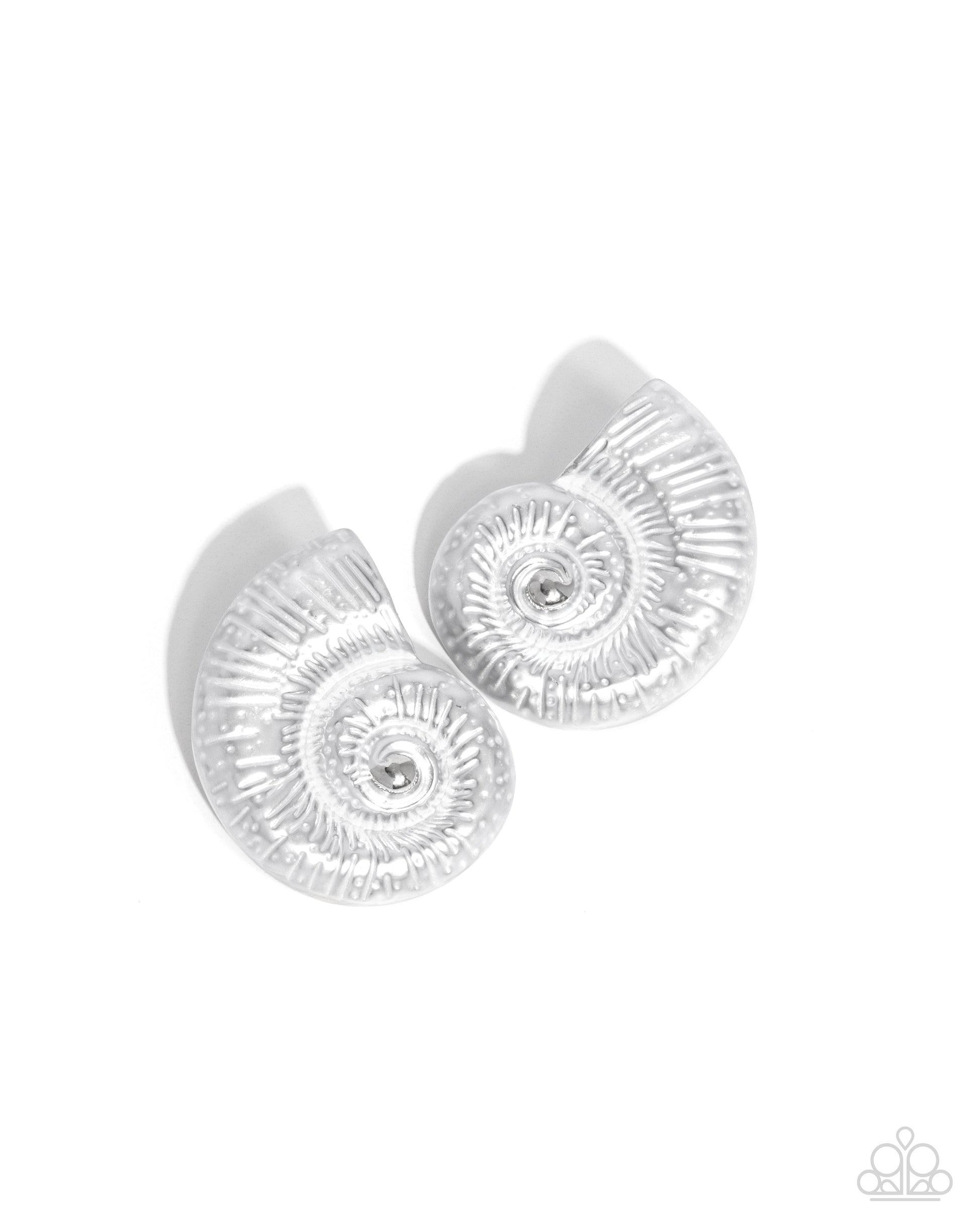 Featuring a shimmery white pearl-painted frame, a spiral seashell design hangs from the ear in a nautical-inspired design. Earring attaches to a standard post fitting.