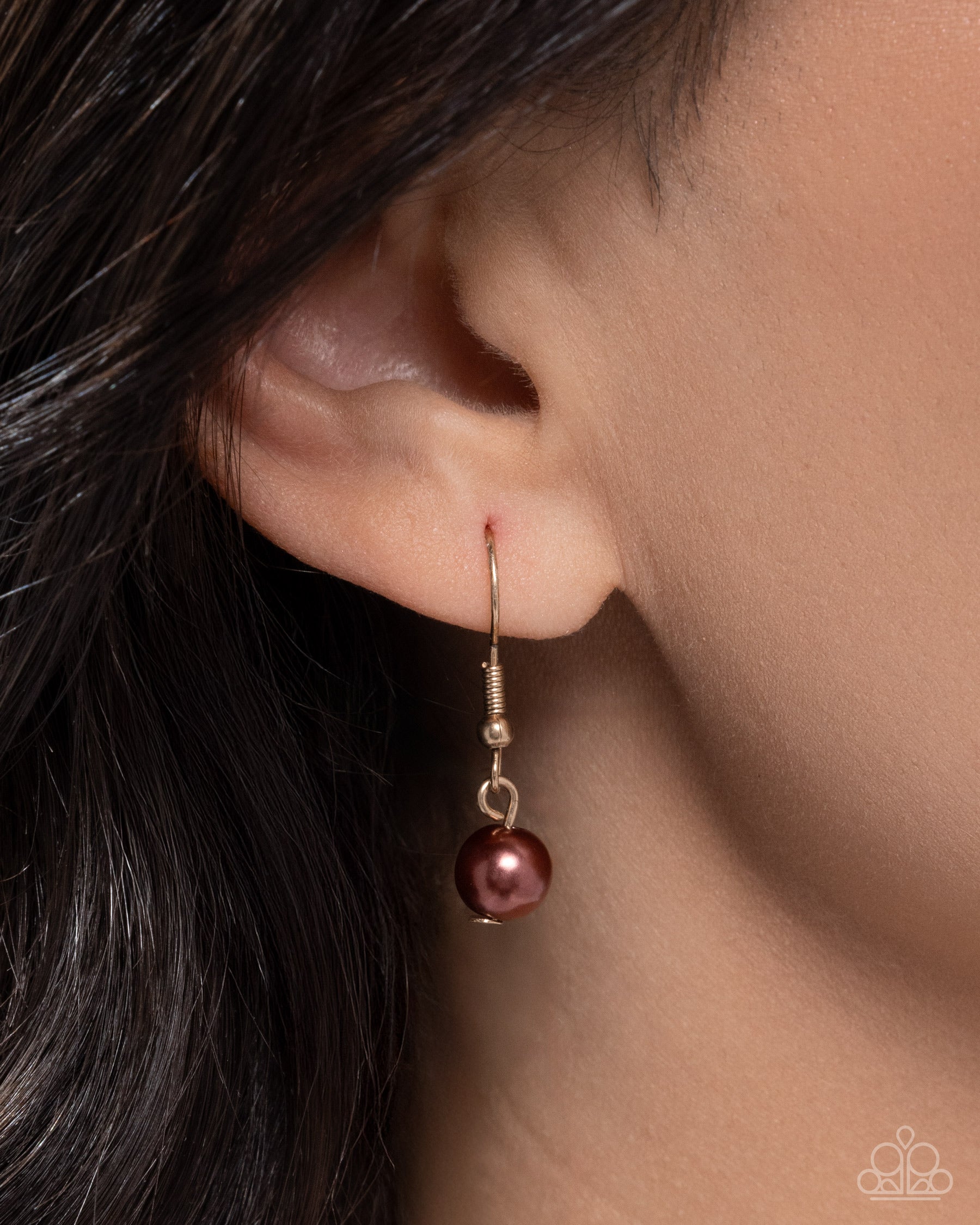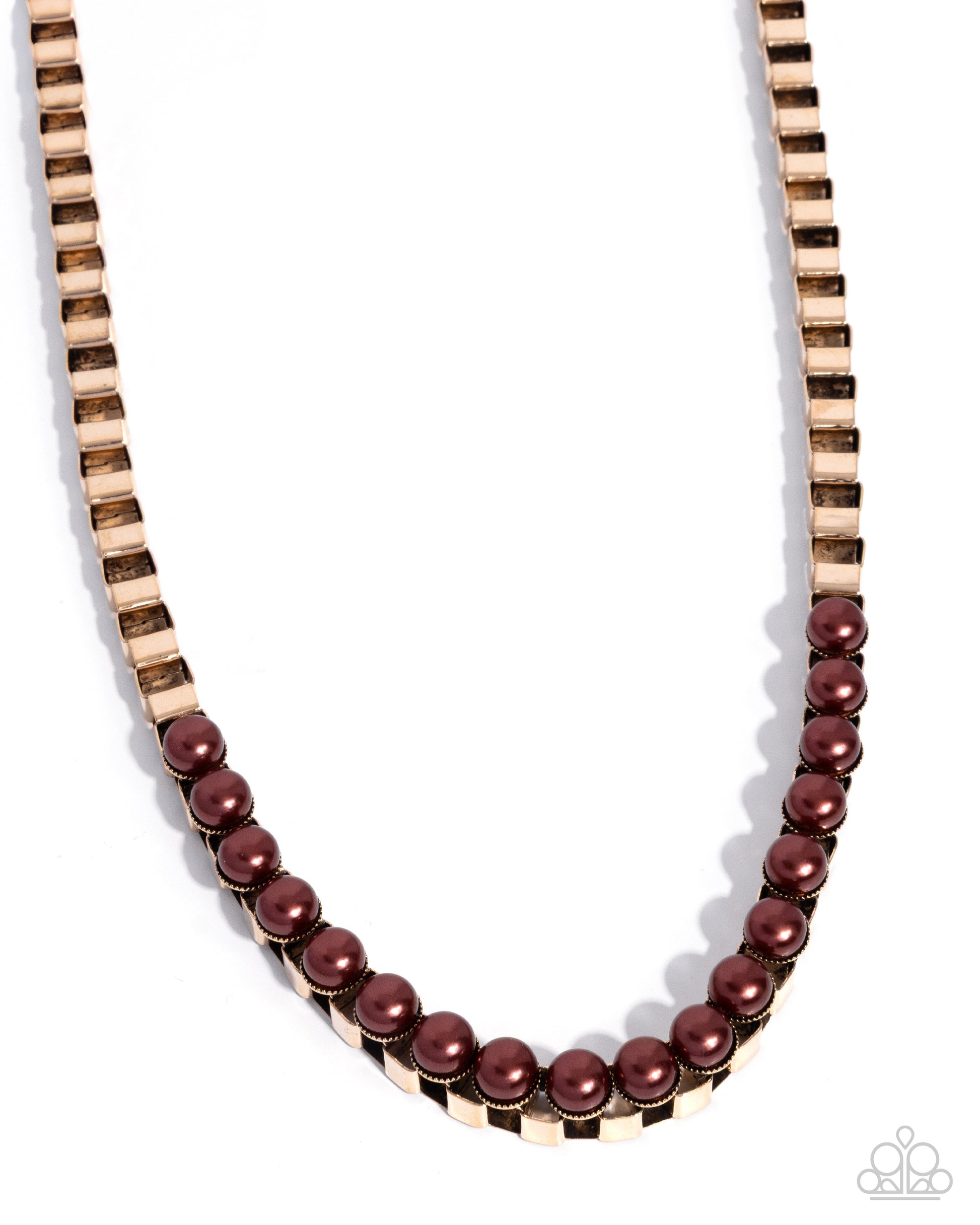 Pressed in elevated gold fittings, a polished row of chocolate half-pearls dots along the center of a thick, antiqued gold box chain for a contrasting display of grunge and glam. Features an adjustable clasp closure.