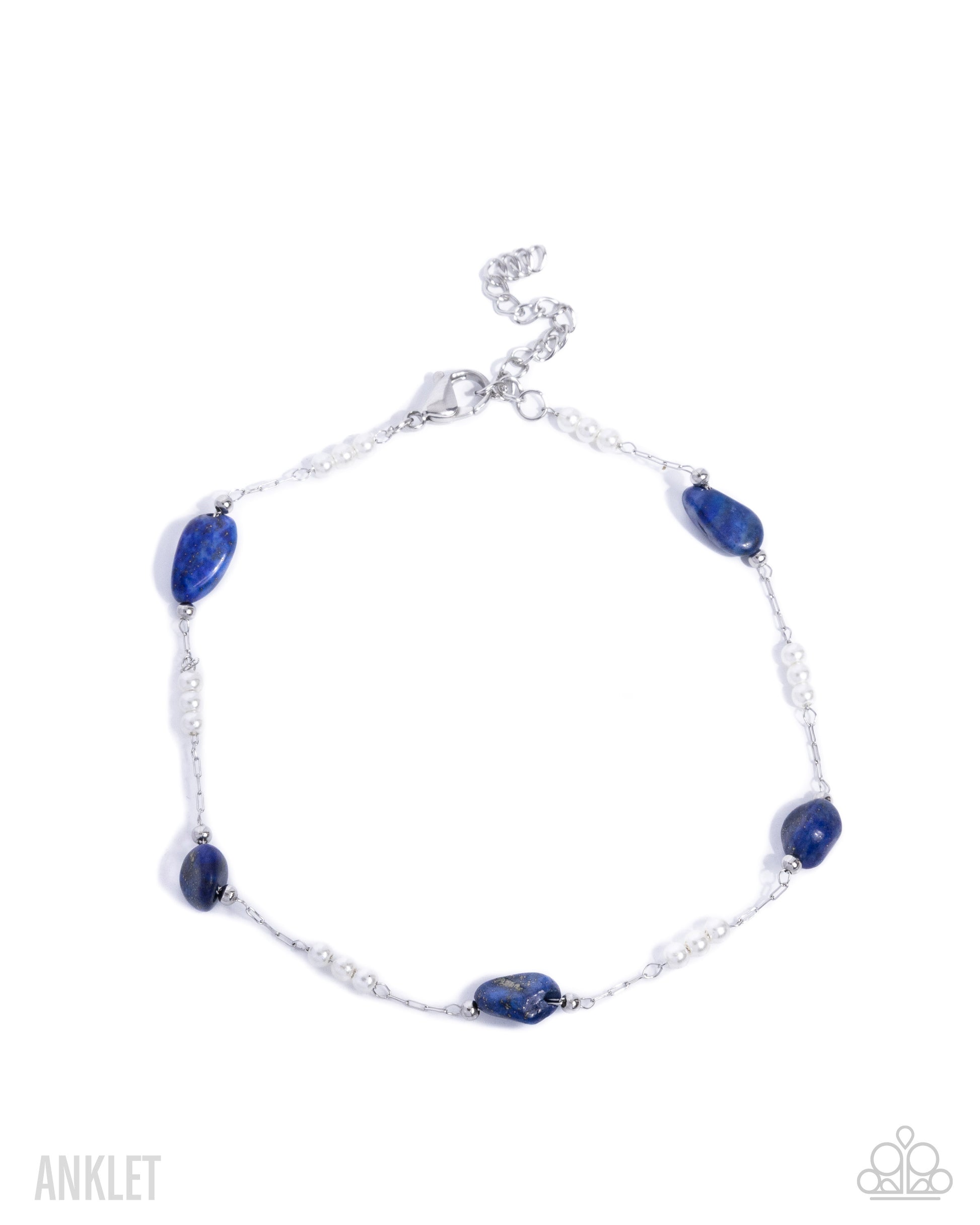 Infused along a dainty stainless steel chain, trios of glossy white pearls and chiseled lapis stones encircle the ankle for an elegantly eclectic display. Features an adjustable clasp closure.
