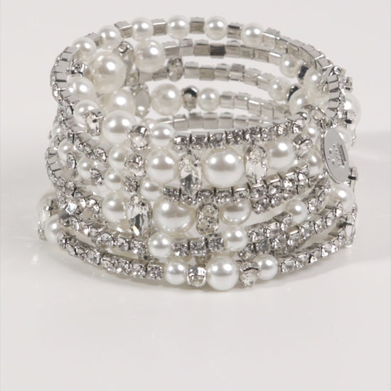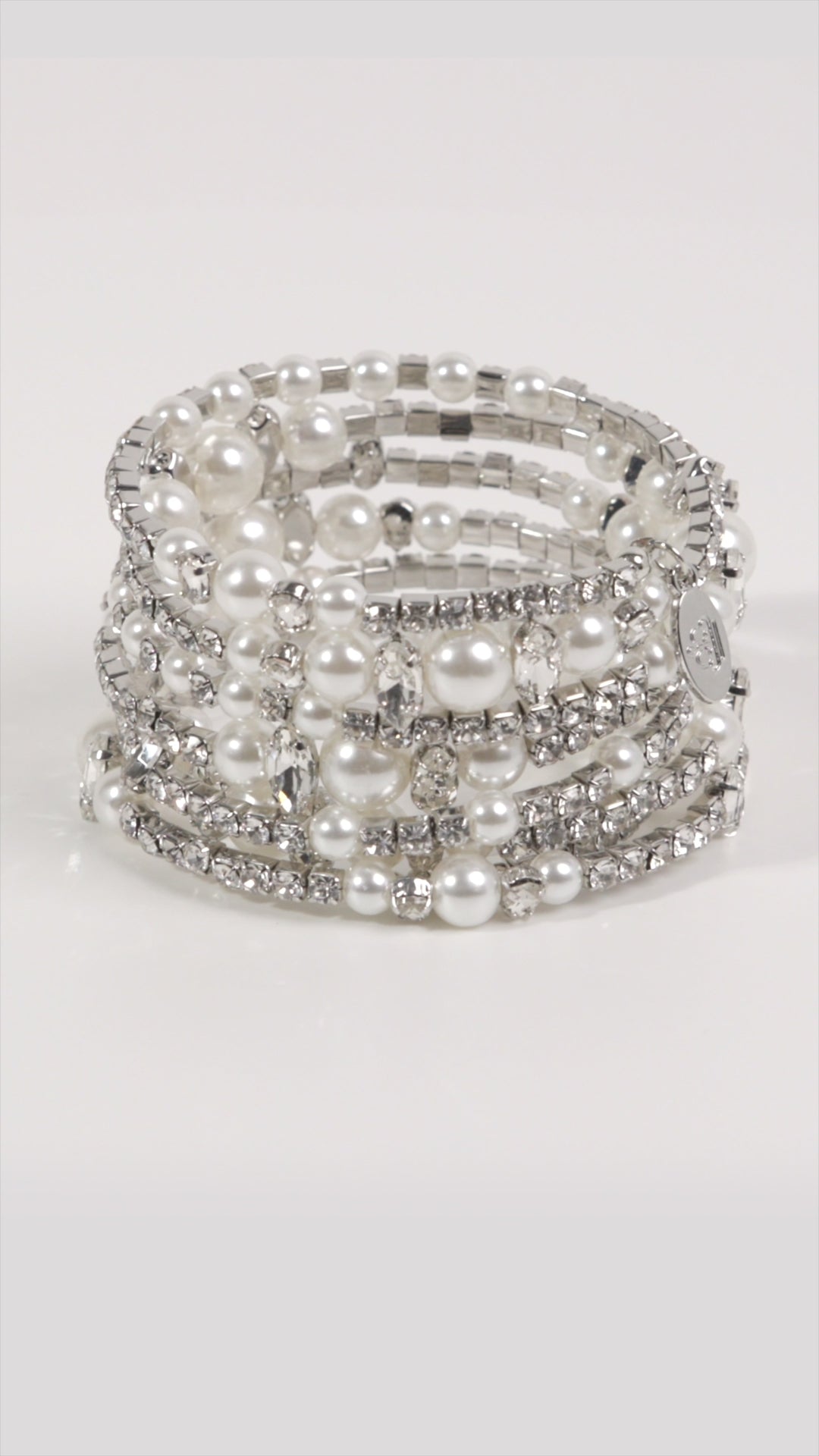 Featuring various dazzling dimensions, a collection of glossy white pearls, elevated-pronged white teardrop and marquise-cut gems, and sparkling white gems in squared silver fittings is threaded along an invisible wire that coils around the wrist. Each flick of the wrist captures a different detail, showcasing the infinity wrap’s irresistible shimmer and range of refinement.