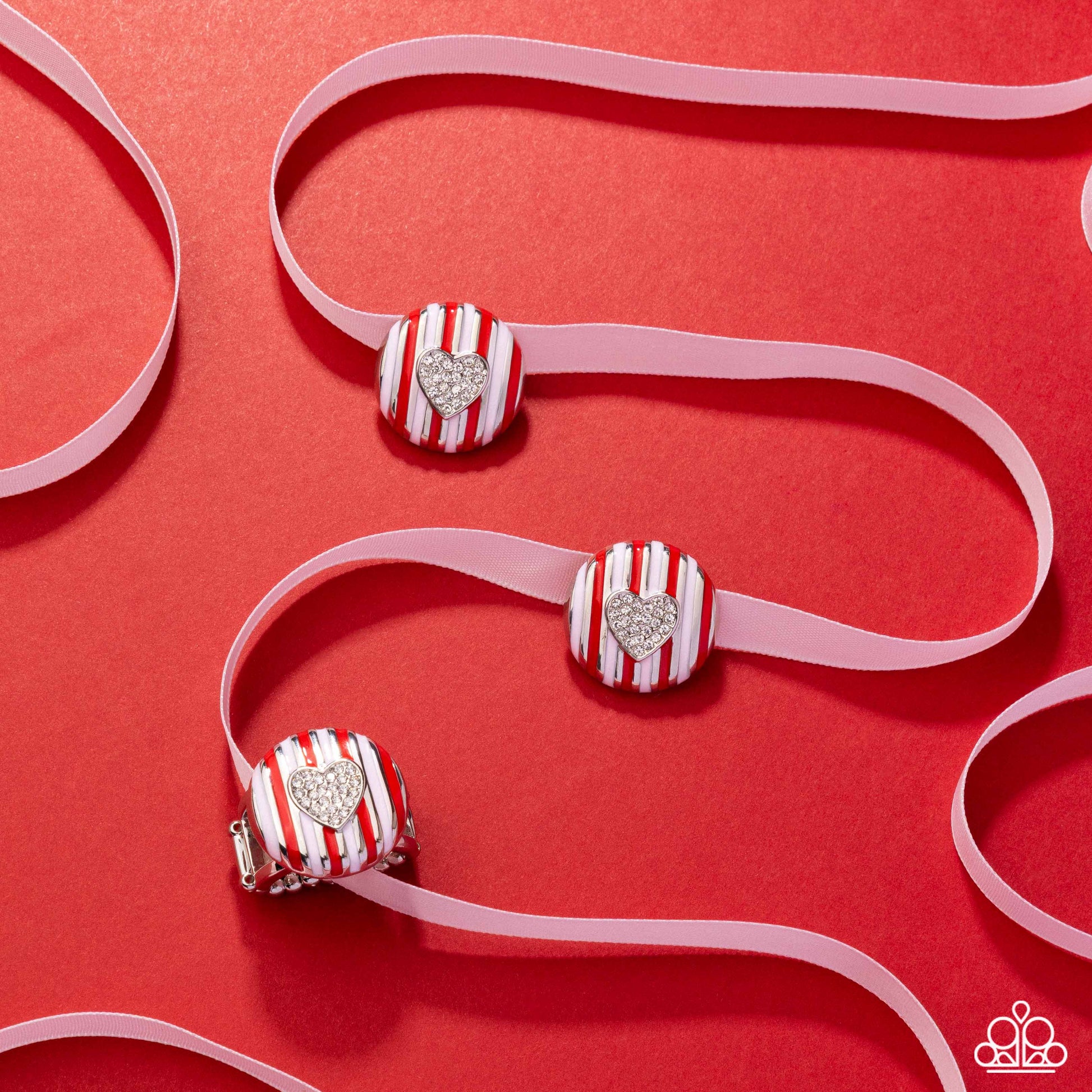 Dusted in white rhinestones, a glistening silver heart stands out against the center of a round backdrop of alternating red, baby pink, and silver stripes for a Valentine's-inspired display atop the finger. Features a stretchy band for a flexible fit.