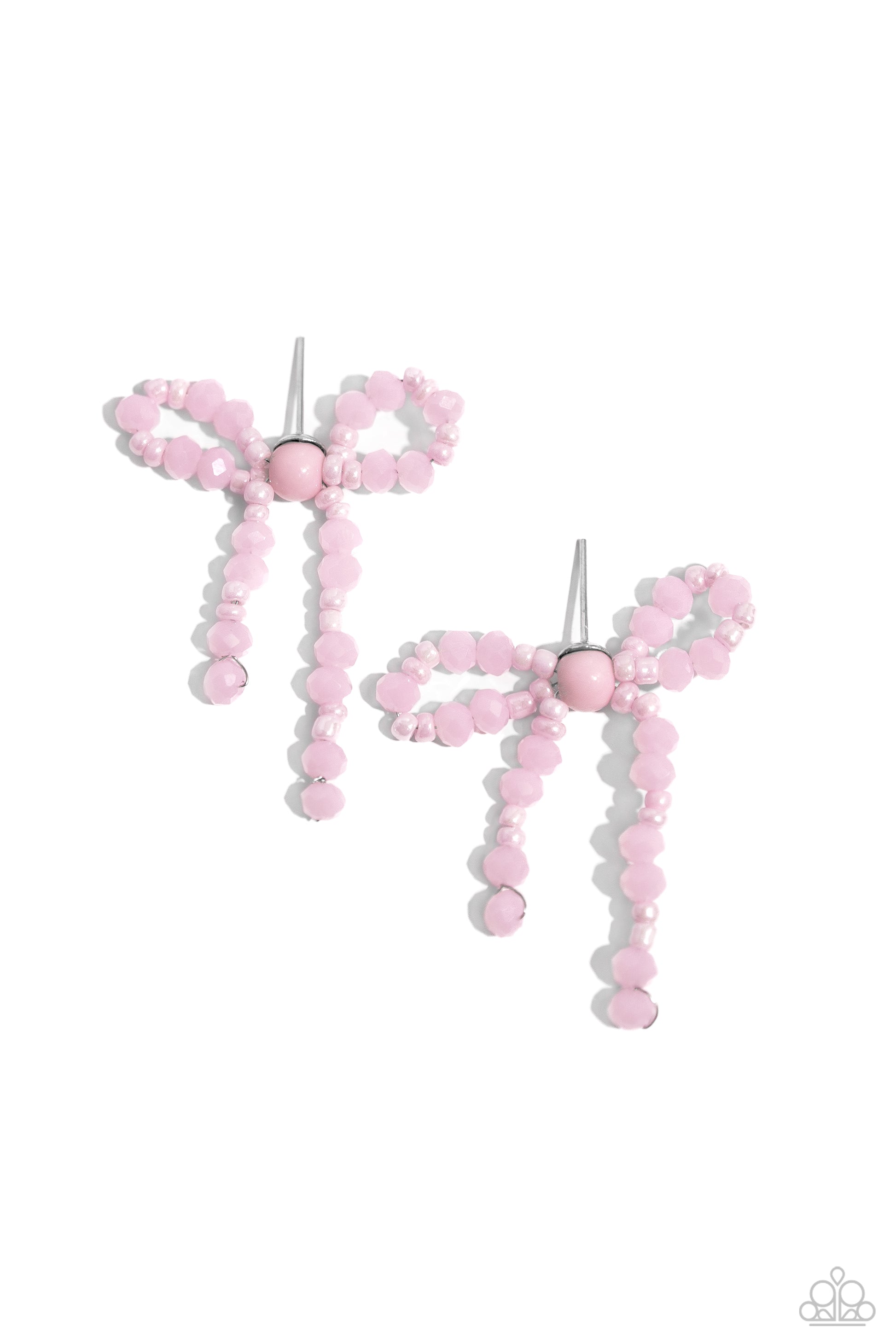High-sheen pink beads in various sizes and baby pink seed beads loop and curl into an elegant, classic bow for a refined centerpiece. Earring attaches to a standard post fitting.