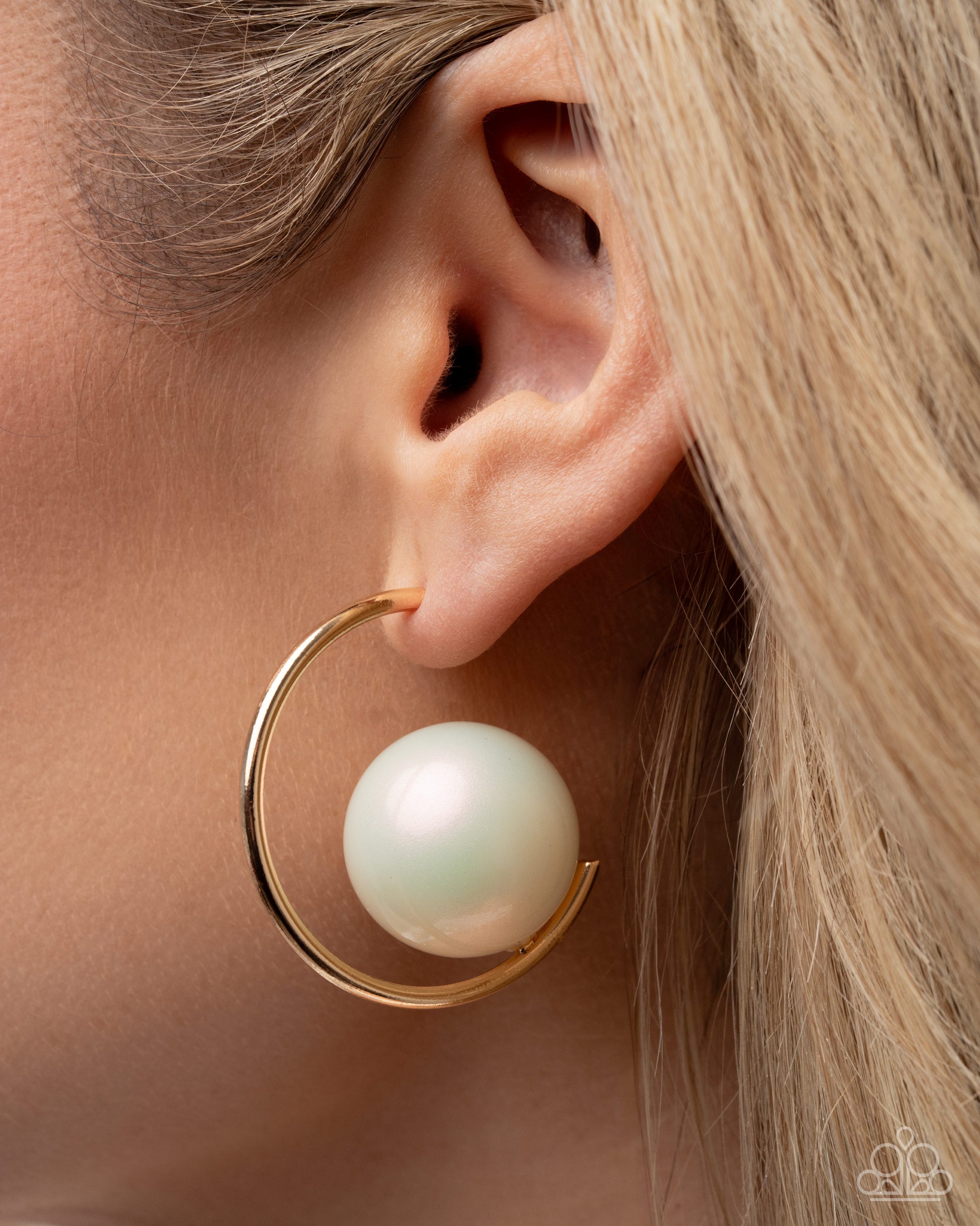 Brushed in an iridescent sheen, an oversized pearl is nestled along the lower curve of a glistening gold hoop, showcasing an exaggerated corporate-chic elegance. Earring attaches to a standard post fitting. Hoop measures approximately 1 1/4" in diameter.Sold as one complete set. Intended for adult use.